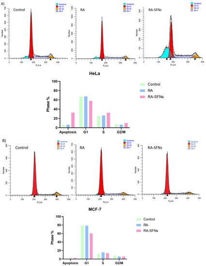 Cell cycle arrest studies were performed on HeLa and MCF-7 cell lines. A total of 2 × 105 cells/well were seeded in 24-well plates and allowed to fix to the plate for 24 h at 37 °C in a 5% CO2 and 95% humidity atmosphere. Then, free RA and RA-SFNs used at 0.226 and 2.4 mg/mL, respectively, were incubated for 24 h. Four wells of each cell line were untreated and used and used as control. At this point, fixed cells were removed from the wells with trypsin-EDTA, collected and centrifuged (250× g, 10 min). The supernatant was removed, and the cells were washed with phosphate-buffered saline (PBS) and centrifuged (250× g, 10 min). After another cycle of centrifugation under the same conditions, the supernatant was removed, and the cells were resuspended in 200 µL of PBS. Subsequently, 1 mL of a PBS (30%)—ethanol (70%) mixed solution was added to the cells. The solution was kept in ice for 30 min. Finally, ethanol was removed by centrifugation. Cells were resuspended in 400 µL of PBS, and 50 µL RNase solution and 50 µL propidium iodide (PI) were added at a final concentration of 0.1 mg/mL and 40 mg/mL, respectively. After stirring, cells were incubated for 30 min in the same conditions as for culture in the dark. The PI fluorescence was measured for each cell in a Becton-Dickinson FACScalibur flow cytometer. In each case 20,000 events were acquired.