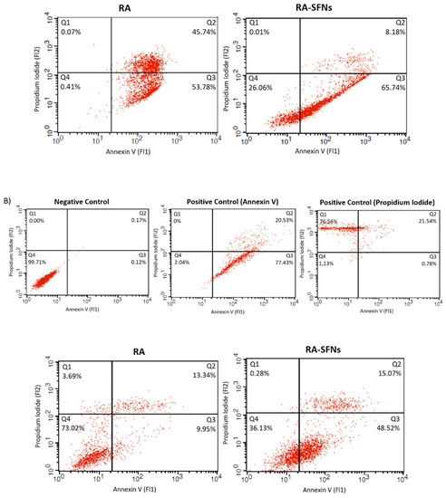 Several in vitro studies with RA found in the literature have shown the ability of RA to inhibit cell proliferation and induce cell cycle arrest in various cancer cells [10,11]. The apoptosis phase after treatment with RA-SFNs was highly evaluated in the following experiment for both cell lines.