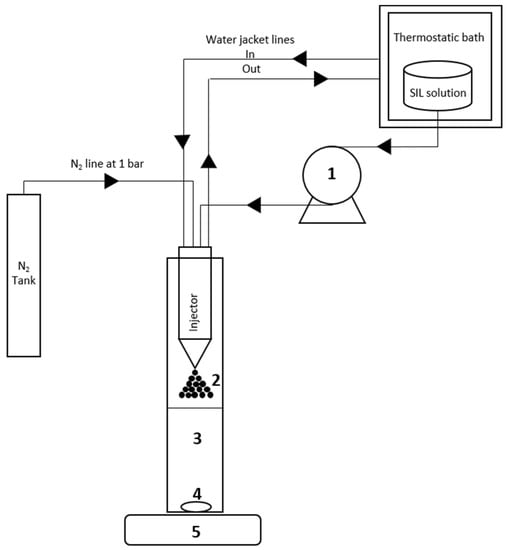 Experimental apparatus used for the SFN synthesis process. (1) Peristaltic pump; (2) SF-[emim+][acetate−] aerosol generated with pressurized N2; (3) Methanol at −20 °C; (4) Stirring bar; (5) Stirring plate [24].