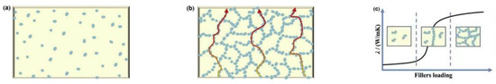 The thermal conduction mechanism of polymer composites is mainly divided into two aspects: thermal conduction percolation theory and thermal conductive pathway theory. Herein, we focus on the latter. The thermal conductivity of composites is improved to various degrees by adding thermally conductive fillers into the matrix [11,12]. It is reflected in the “sea-island” structure when the content of the filler is small, which indicates very little contact between the fillers, and the heat transfer is very fast even in the filler. Moreover, even if the heat transfer is very fast in the fillers, the thermal resistance of the filler–matrix interface limits the improvement of the thermal conductivity of composites [13,14]. The addition of fillers reduces the distance between the “sea islands” until the occurrence of contact phenomena. Thus, pathways are formed through some parts or the entire material. Then, the thermal conductivity of the filled composite is significantly improved (Figure 2a). In this process, the agglomeration phenomenon between fillers (which cannot be ignored) can be considered a turning point for constructing thermal conductive network pathways. Once the agglomeration is transformed into a thermally conductive network structure (Figure 2b), the thermal conductivity will increase rapidly (Figure 2c) [15].