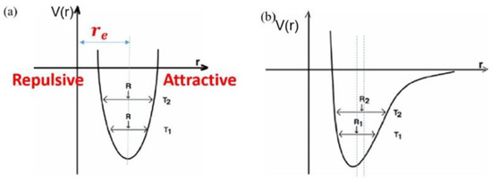 CTE is an important indicator for quantifying the expansion or contraction deformation of a material after being heated. The thermal expansion of a solid can be summarized as follows: when the temperature increases, the kinetic energy of adjacent atoms in the solid increases, increasing the average distance and the generation of thermal expansion. This is the source of vibration for thermal expansion. When the degree of separation of atoms is symmetrical to the potential energy, zero thermal expansion occurs, and NTE is the same as shown in Figure 3 [23]. In Figure 3a, the ordinate V(r) is the potential energy of the interaction between atoms, and the abscissa r is the size of the interaction distance between the atoms. The interaction force between atoms is expressed as (−(dE(r))/dr). The equation shows that when the potential energy corresponding to the re position is the smallest, and the force is 0, which indicates the most stable structure. When the temperature increases, the interaction force between two atoms can be completely offset, and the equilibrium position does not change with the temperature; therefore, there is no macroscopic thermal expansion. In normal circumstances, atoms cannot return to equilibrium (that is disharmonic vibration), which is macroscopically expressed as positive thermal expansion or NTE, as shown in Figure 3b. When materials with different CTEs are used to control the CTE of composites, it can be realized in terms of material ratio and microstructural design. When combined with actual fillers, it can be further subdivided into the concentration, size, and shape of the filler.