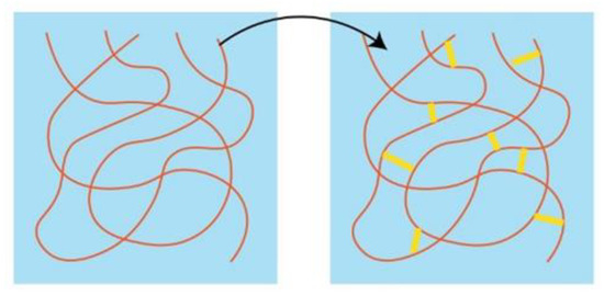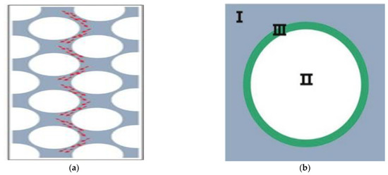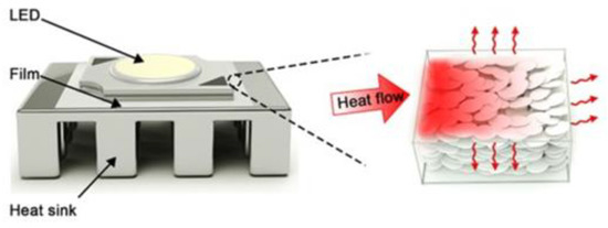 There are two factors affecting the thermal conductivity of composites filled with thermally conductive particles. The first is the heat conduction pathway, that is, the ability to form phonon transmission paths. If a heat conduction filler can form more heat conduction channels in a composite, the phonon transmission capacity would be stronger, and the thermal conductivity of the composite would be higher. However, most of the thermally conductive particles form chains or agglomerates inside the matrix. When the thermal conduction chain structure is generated, the weak interaction between the chains becomes thermal resistant. Therefore, the capacity for heat transmission of the polymer can be improved by enhancing the interconnection between the chains, which increases the thermal conductivity of the polymer. Then, the internal structure of the polymer is as shown in Figure 4 [29].