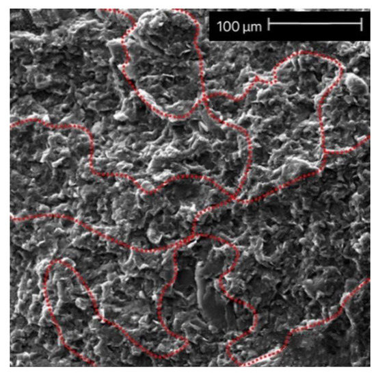 When the agglomeration occurs, the thermal conductivity of the composite is not greatly improved, but it is considered a turning point in the construction of thermal conduction network pathways. Once the agglomeration is transformed into a thermally conductive network structure, the thermal conductivity increases rapidly. The SEM image of a thermally conductive path formed by a connected thermally conductive filler is shown in Figure 5. The second factor affecting the thermal conductivity of composites filled with thermally conductive particles is the interface thermal resistance. The thermal resistance between the matrix molecules is generally much greater than that between fillers. If there are more filler–matrix interfaces, it is difficult to increase the thermal conductivity of the composite. After combining the above factors with the actual filler, the factors affecting the thermal conductivity of composites can be further subdivided into the concentration, size, shape, type of filler, and interaction between the matrix and the filler [1,29,30,31,32]. Chung et al. [33] studied the effects of filler content, particle size, oxygen content, and surface treatment on the thermal conductivity of epoxy-based composites. Within the range of factors investigated in the research, it was found that the filler content has the greatest impact on the thermal conductivity of composites. As the proportion of filler volume was increased from 10% to 60%, the thermal conductivity increased by 1567%. Among the other factors, particle size had the greatest impact on the thermal conductivity of composites. When the filler content was 60%, the increase in the percentage of thermal conductivity reached at 106%, which is attributed to the particle size.