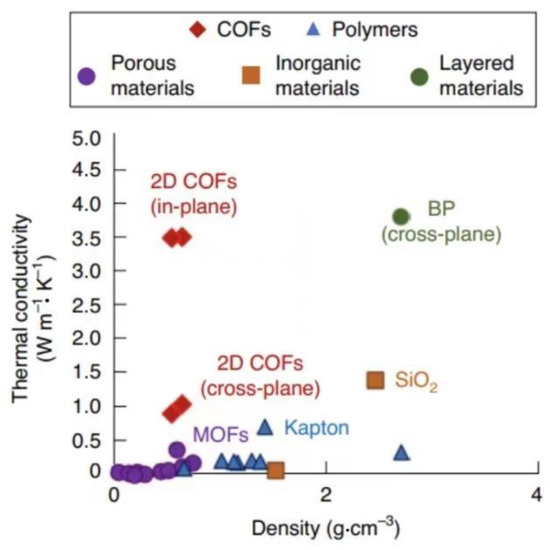 Recently, 2D covalent organic frameworks (2D-COFs), which have the same properties, have been used in many fields. Evans et al. [45] synthesized 2D-COFs film by the template gel method. The thermal conductivity of the composite was as high as 1 W·m−1·K−1, and the dielectric constant was as low as 1.6. Compared with other organic or porous materials (Figure 7) 2D-COFs exhibit an extremely high thermal conductivity at the same density. In general, BN fillers have excellent thermal conductivity and insulation properties and can construct a heat conduction pathway inside composites after adjusting the microstructure. However, in practical applications, this type of filler is expensive and generally added only in a small amount, that is, it is added as an auxiliary filler together with other fillers to improve the thermal conductivity and insulation performance of composites.