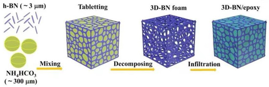 Considering the influence of the microstructure on the overall thermal conductivity of composites, a specially designed heat conduction path is constructed during the processing to reduce transmission resistance of phonons to obtain high thermal conductivity in a certain direction [46,47,48,49]. As shown in Figure 8, Xu et al. [50] constructed a 3D BN foam to achieve good thermal conductivity and insulation simultaneously. A self-supporting and pressure-enhanced 3D BN foam can be constructed by mixing BN powder and ammonium bicarbonate particles and then removing the ammonium bicarbonate by heat treatment. Then, the foam is immersed in a liquid epoxy mixture to obtain a 3D-BN/epoxy composite through a curing process. Chen et al. [51] mixed BN with a salt template at first to dissolve polyvinylidene fluoride (PVDF) as a binder in acetone to prevent the precipitation of BN (Figure 11). Then, they used acetone to evaporate and remove salt to form a BN network. Finally, they employed the vacuum-assisted impregnation method to infiltrate the epoxy resin into the stent to prepare the corresponding composites.