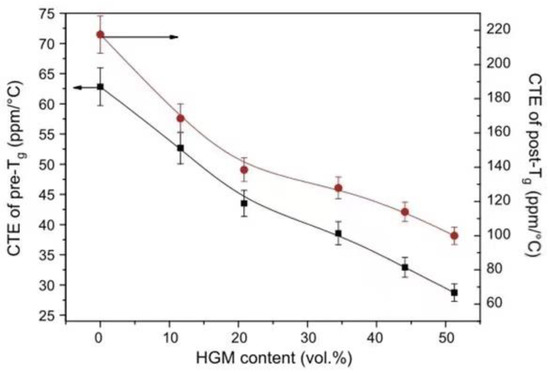Considering thermal expansion, the significantly low CTE of glass microspheres and their interaction with epoxy resin are the main reasons for the decrease in CTE of the composite. The low CTE can enhance the thermal stability of the composite to a certain degree, and it is difficult to age under long-term light [60]. Pei et al. [61] established Table 1 based on experimental studies. The thermal expansion coefficient of a composite has a downward trend when the HGM ratio increases, and the performance of the composite is improved. Yung et al. [62] measured the CTE of a composite before and after the glass-transition temperature. As shown in Figure 11, the addition of HGM significantly changed the performance of the composite.