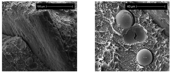 Tamara et al. [63] investigated HGM and Piasa fibers mixed with resin. Experiments showed that there is no great adhesion between HGM and the matrix in the absence of a coupling agent. This increases the thermal resistance of the filler/matrix interface. This weak interaction inevitably results in the poor electrical, mechanical, and thermal properties of the composite, and the heat transfer capability can be significantly enhanced by optimizing the filler–matrix interconnection. This is consistent with the experimental results of Wouterson et al. [64]. The microscopic morphology of the sample is shown in Figure 12 and Figure 13. It shows that it is necessary to modify the surface of HGM to improve the performance of the composite. Common surface modification methods include coupling agent modification, acid–base etching, plasma surface treatment, and elastomer-coating treatment [65].