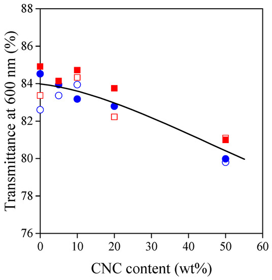 Transmittance of TPS–CNC composites at 600 nm as a function of CNC content. Symbols: (○) 30% glycerol; (●) 40% glycerol; (☐) 30% sorbitol; (■) 40% sorbitol.