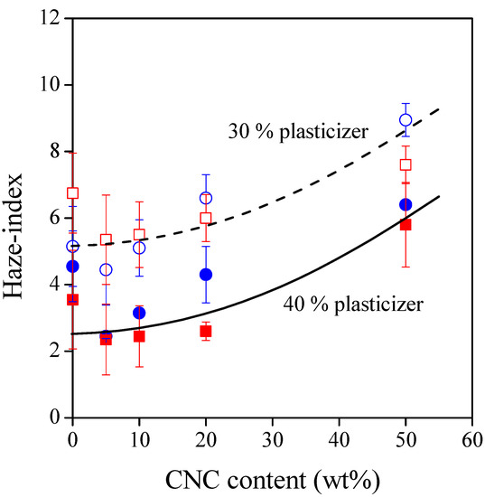 Haze index of TPS–CNC composites at 600 nm as a function of CNC content. Symbols: (○) 30% glycerol; (●) 40% glycerol; (☐) 30% sorbitol; (■) 40% sorbitol.