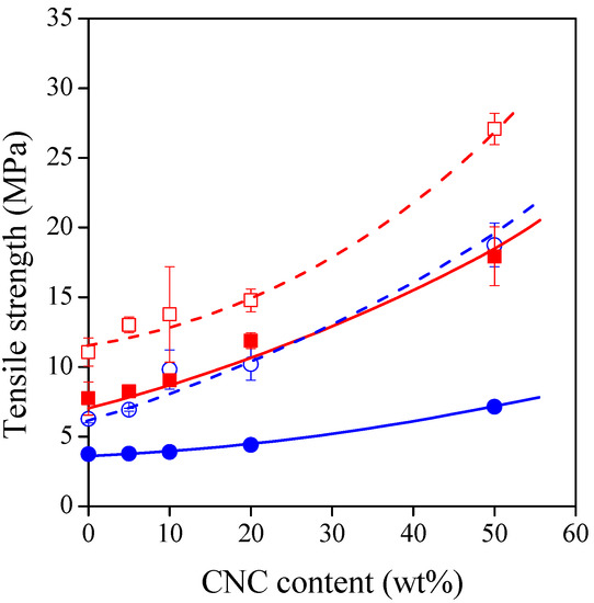 Tensile strength of TPS–CNC composites as a function of CNC content. Symbols: (○) 30% glycerol; (●) 40% glycerol; (☐) 30% sorbitol; (■) 40% sorbitol.