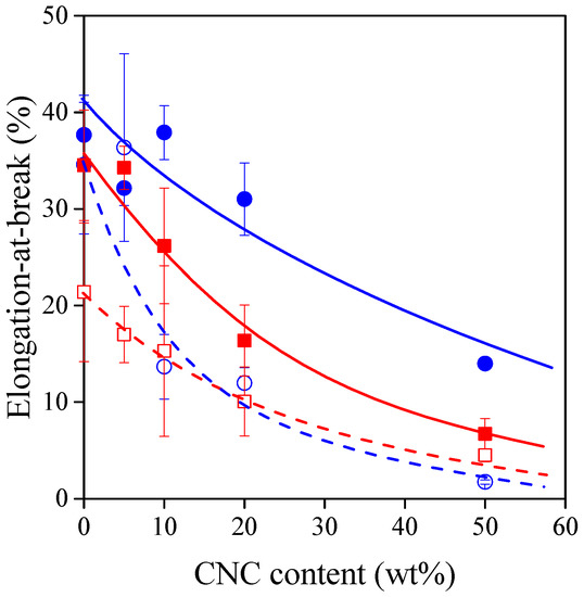 Elongation-at-break of TPS–CNC composites as a function of CNC content. Symbols: (○) 30% glycerol; (●) 40% glycerol; (☐) 30% sorbitol; (■) 40% sorbitol.