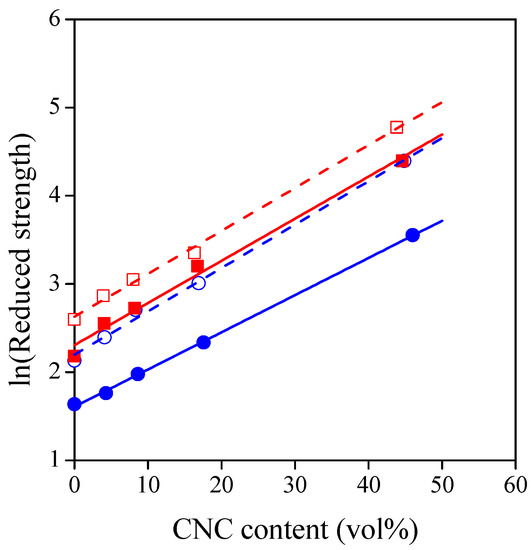 Reduced strength of TPS–CNC composites as a function of CNC content. Reduced strength is defined in Equation (3). Symbols: (○) 30% glycerol; (●) 40% glycerol; (☐) 30% sorbitol; (■) 40% sorbitol.