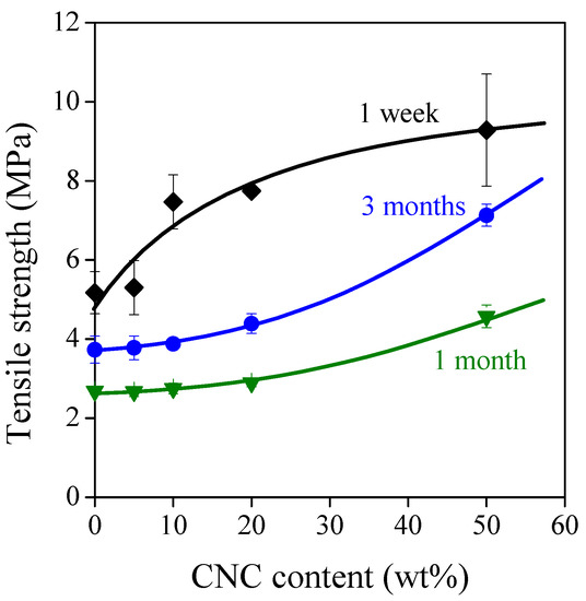 The properties of TPS alter with time since plasticization enables the segmental motion of amylose and linear parts of amylopectin molecules, triggering a recrystallization process called retrogradation [29,30]. Mechanical properties are extremely sensitive to the changes in the crystalline structure; therefore, the aging of TPS composites was characterized by their tensile strength values after 1 week, 1 month, and 3 months (Figure 9). Previous studies showed that the retrogradation of TPS results in an increase in tensile strength due to the increased crystalline ratio [7,13]. Nevertheless, Figure 9 shows that the strength of TPS and TPS–CNC composites has a minimum value after 1 month, and it does not gain back its original value even after 3 months. This means that there is another process competing with retrogradation.