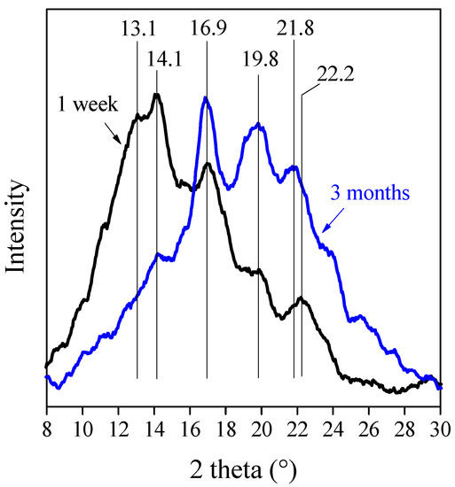 The changes in the crystalline structure of TPS are demonstrated by XRD diffractograms in Figure 10. The two theta peaks at 13.1° and 14.1° represent the Va-type crystals, while the peaks at 16.9°, 19.8°, 21.8°, and 22.2° appear due to the presence of Vh-type crystals [46,47]. The diffractograms prove unambiguously that Va-type crystals transform into Vh-type crystals during aging. According to Zobel et al. [48], the amylase helices of Va lattice are more contracted and they contain less water compared to Vh lattice. This implies that the transformation of Va-type crystals originates from the hydration of TPS, which is caused by the additional water uptake from the atmosphere. Based on the results of Dai et al. [49], this recrystallization process is reversible; thus, the Vh-type crystals can transform back to Va-type crystals in dehydration conditions.