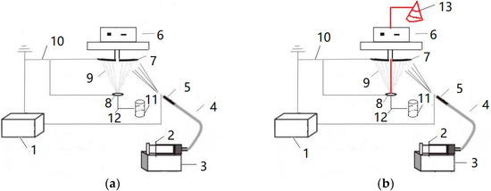 The electrospinning nanofiber yarn forming device is shown in Figure 1a. The spinning solution was transported to a single needle through a pipe conveying fluid by an injection pump. The polymer formed nanofibers under the action of a high voltage electric field, and orientated nanofibers formed between the grounding disk and the grounding ring. The rotation of the metal disk twists the oriented nanofibers to form nanofiber yarns. The electrospinning nanofiber-wrapped yarn forming device is shown in Figure 1b. Figure 1b has a larger core yarn unwinding system (13) than Figure 1a, which is marked in red. The 75D/36F non-twisted polyester multifilament unwound from the bobbin was used as the core yarn and passed through the center of the disk and the center of the ring, in turn. The rotating metal disk twisted the oriented nanofibers and wrapped the nanofibers on the core yarn. The fiber covered the structural yarn, and the formed covered yarn was finally wound on the finished bobbin by a winding device.