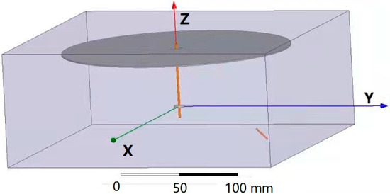The three-dimensional space model established according to the experimental device is shown in Figure 2. The high voltage power supply, bracket, platform, and other devices that have little influence on the electrostatic field were neglected, leaving only the single-needle nozzle and the receiving ring and disk portion, which greatly influence the working electric field. The distance between the ring and disk was set to 9 cm, the angle between the needle and the disk was 45°, the voltage was 18 kV, and the other parameters were the same as in Section 3.2.2. The needle was located in the lower right corner of Figure 2, which was marked as a short brown line.