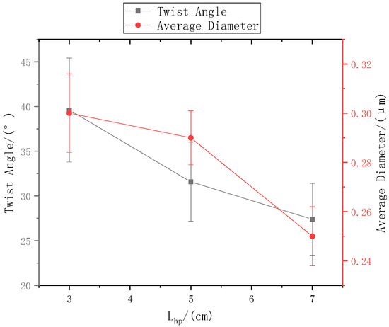 When the distance from the ring to the disk was set to , the distance from the needle to the center of the disk is 9 cm, and the rotation speed n of the disk was 40 r/min. The SEM images in Figure 5a,b, and c respectively show that the nanofiber yarn was prepared by changing from 3 cm, 5 cm, and 7 cm. The nanofibers formed yarn twisted in the z-direction, and the average twist angle decreased as increased (Figure 6). At a constant disk rotation speed, the number of twists per unit time was constant, and the twisting of the nanofiber yarn theoretically remained unchanged. The diameters of the electrospinning nanofiber yarns in a, b, and c of Figure 5 were (88.0 ± 5.3) µm, (77.0 ± 3.9) µm, and (76.8 ± 3.0) µm, respectively. As the distance from the ring to the disk increased, the diameter of nanofiber yarns increased because the greater the twist angle β of the yarn with the same twist, the greater the twist of the fiber, resulting in a thicker yarn. Nanofibers oriented between disks and rings tend to be stretched and refined upon increasing the distance between them.
