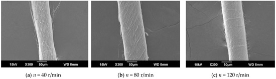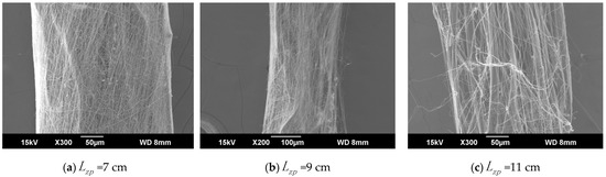 Figure 11a–c show that when = 7 cm, the nanofiber-wrapped core yarn was relatively uniform, and no core exposure was observed. However, in b and c of Figure 11, the exposed core was completely visible through the surface of the nanofibers. The core yarn was composed of many untwisted monofilaments. The Figure 11a–c show that at a certain spinning time, as increased, the effect of the nanofiber wrapping structure became increasingly worse, and the wrapping surface became smaller. This is also because, at greater distances, there were fewer oriented nanofibers between the ring and the disk, and the nanofiber yarn diameter decreased as increased. However, we can also infer that as the spinning time of the electrospun nanofiber-wrapped structure yarns was extended from 5 min to 15 min, more oriented nanofibers were wrapped on the core yarn, and the wrapping effect was better.