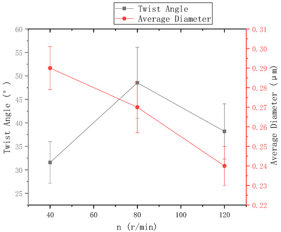 The ring-to-disk distance was 5 cm, and the rotation speed n of the disk was 40 r/min. The SEM images in Figure 7a, b, and c respectively show the nanofiber yarns prepared by changing at 7 cm, 9 cm, and 11 cm. Figure 7a,b, and c show that the nanofibers formed z-twisted twisted yarns, and the average twist angle of the nanofiber yarns slightly increased upon increasing . The difference between the twist angles was not large, but a slight increase was observed in Figure 8. The diameters of nanofiber yarns prepared with = 7 cm, 9 cm, and 11 cm were (80 ± 7.81) µm, (77 ± 3.9) µm, and (48.4 ± 5.43) µm, respectively. The nanofiber yarn diameter decreased farther away from the center of the disk. Fewer oriented nanofibers between the ring and the disk formed when the needle was farther away, and there were more non-oriented fibers; however, less-oriented nanofibers were twisted, resulting in a finer twisted yarn. The farther the needle was from the disk center, the smaller the average diameter of the nanofibers in Figure 8 because at greater distances, the nanofibers had more time to stretch in the electric field, and their average diameter decreased.