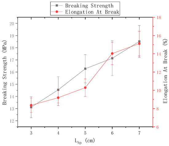 The distance of the needle from the center of the disk was 9 cm and the rotational speed n of the disk was 40 r/min. Figure 12 shows the mechanical properties of electrospun nanofiber yarns prepared using ring-to-disk distances of 3 cm, 4 cm, 5 cm, 6 cm, and 7 cm. Figure 11 shows that the breaking strength of nanofiber yarns prepared was the highest (18.51 ± 1.31) MPa, when = 7 cm, and the elongation at break was the highest 15.11%, which is more suitable for traditional weaving processing. The fracture strength and elongation at break of the nanofiber yarns increased gradually, mainly because the length of the oriented nanofibers between the rings and disks increased upon increasing the distance, which strengthened the orientation degree of macromolecules along the nanofiber direction, and thus improved the mechanical properties of the fibers. Theoretically, if the distance between the needle tip and the center of the disk exceeds a certain limit, few nanofibers will be collected by the device due to the large receiving distance, and yarn will not form.