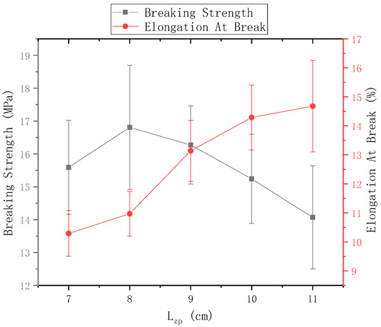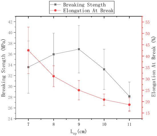 The ring-to-disk distance = 5 cm, and the rotational speed n of the disk is 40 r/min. Figure 13 shows the mechanical properties of electrospun nanofiber yarns prepared when the distance between needle and disk center = 7 cm, 8 cm, 9 cm, 10 cm, and 11 cm. The breaking strength of the nanofiber yarn was the highest (16.81 ± 1.89) MPa, when = 8 cm, but its breaking elongation did not reach a maximum. As between the needle and the disk center increased, the fracture strength of the yarn increased first and then decreased, and the elongation at break always increased. As increased, the nanofibers had sufficient time to stretch and draw in the electric field, and the macromolecular orientation in the nanofibers was consistent with the axial direction, so that the fracture strength of the yarn increased; however, when was large, some nanofibers were scattered outside the twisted area, and no oriented nanofibers formed between the disk and the ring. Thus, too few fibers were formed in the nanofiber yarn, which decreased the fracture strength.