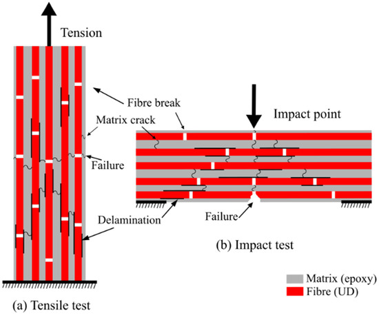 Damage sequence of UD FRP composites tensile mode (modified from [35]) and impact mode (modified from [39]).