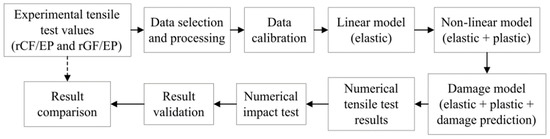 Figure 4 presents the overall methodology adopted. Commercially available FE software Abaqus/CAE was used to perform both the numerical TTs and ITs. The tensile and impact models were developed based on explicit non-linear analysis using the experimentally measured TT data as inputs. The FE analysis was performed for all five composite types: EP (100%), rGF/EP (40 and 60%) and rCF/EP (40 and 60%).