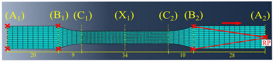 The numerical TT simulation was performed using a dogbone-shaped sample. The sample was designed and extruded based on ISO 527-2 specimen type 1BA standard [32], similar to the samples used during the experimental TT. After the primary modelling, based on the overall sample length of 100 mm, it was divided into seven points, which were A1, B1, C1, X1, C2, B2 and A2, and five cells, which were A1–B1, B1–C1, C1–C2, C2–B2 and B2–A2, in that order (see Figure 5).