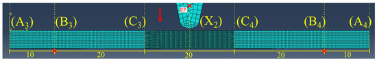 The numerical IT was performed using a rectangular sample and an impactor (hammer). The sample was designed and extruded based on the dimensions from ISO 179-1 type 1 test specimens 80 mm × 10 mm × 4 mm under charpy unnotched impact strength [33]. The actual dimensions of the hammer were measured and modelled to achieve a closer simulation to experimental IT. After the primary modelling, based on the overall sample length of 80 mm, it was divided into seven points, which were A3, B3, C3, X2, C4, B4 and A4, and five cells, which were A3–B3, B3–C3, C3–C4, C4–B4 and B4–A4, in that order (see Figure 6). The parts (sample and hammer) were then assembled by placing the hammer tip above X2, maintaining a small gap between the parts.