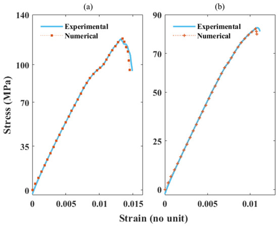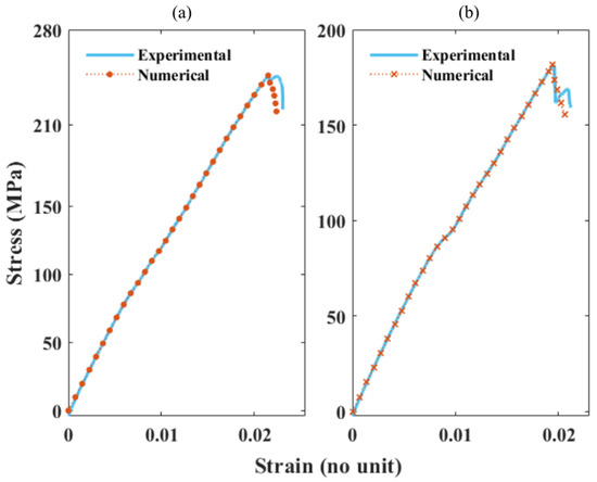 Comparing experimental and numerical SS curves of rCF/EP composites: (a) SS curves of 60% rCF/EP; (b) SS curves of 40% rCF/EP.
