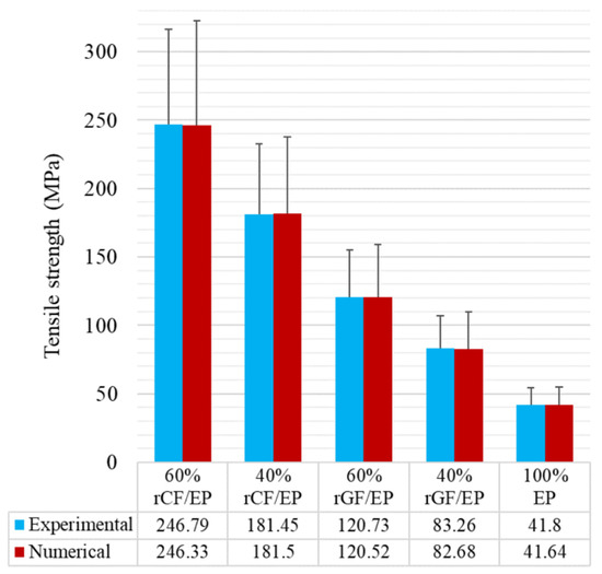 Measured tensile strength of the composites experimental vs. numerical.