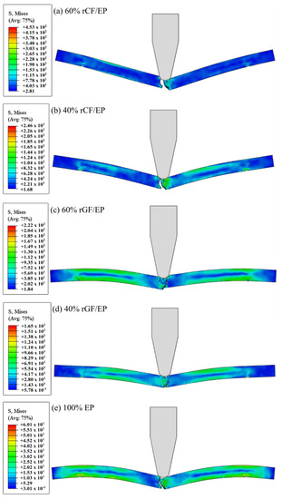 Numerical IT results using von Mises stress distribution: (a) 60% rCF/EP; (b) 40% rCF/EP; (c) 60% rGF/EP; (d) 40% rGF/EP; (e) 100% EP.