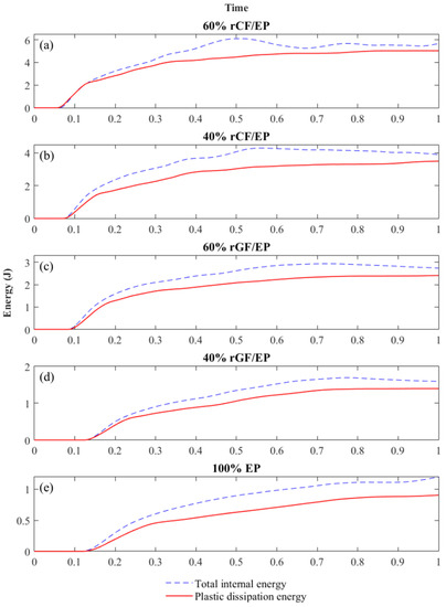 Figure 13 presents the total internal energy and plastic dissipation energy observed by the composite samples after the numerical IT. The energy measurement starts as the hammer contacts the sample (damage initiation). Further, as the hammer progressed based on the applied velocity and time step, the crack propagation parallel to the impact direction finally ends with a fracture. Thus, the recorded maximum energy at fracture was taken as the plastic dissipation energy observed by the samples. During numerical IT, the energy dissipation in the samples increases with respect to the hammer velocity, and is required to establish a boundary [53]. Such entities were also observed during the simulation process. The modelling failed with errors at higher velocities, as the sample energies were not fully recorded based on the established time interval, and at lower velocities, the samples remained undamaged. Finally, after repeated estimations using lower velocities, the hammer velocity for all of the composite types were fixed as follows: 8.1 m/s (60% rCF/EP), 7.1 m/s (40% rCF/EP), 6 m/s (60% rGF/EP), 4 m/s (40% rGF/EP) and 4.25 m/s (EP).
