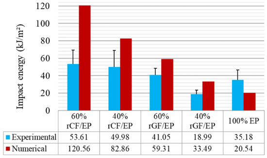 Measured impact strength of the composites experimental vs. numerical.