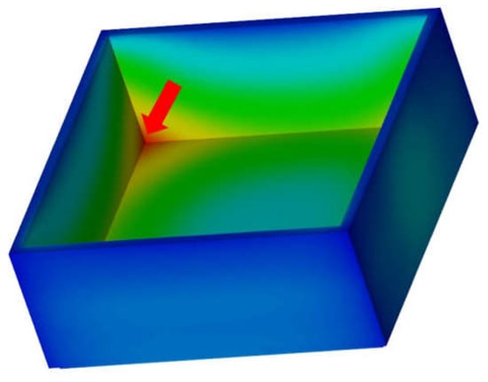 For both wall thicknesses (1 and 3 mm) and each of the polymers, an individual optimal packing and rest cooling time was determined for the 1.2343 ESU steel grade with several iterative simulation loops. The found parameters for each polymer were then also used for the test alloy. For both wall thickness variations, the hotspot of the part was identified in the corners of the box, close to the part surface being in contact with the mold core, where the heat coming from the polymer cannot be carried away quickly enough into the mold core (region indicated with the red arrow in Figure 3). This region was determining the required cycle time. Therefore, a specific node in one of these corners was selected for both wall thickness variations for the evaluation of all polymers to obtain comparable results. For the comparison of the cycle times, the part temperature result of this node for different process time steps was exported from Moldflow. These discrete temperature/time results were then approximated with a polynomial function. With this function, the exact time could be calculated, at which the recommended ejection temperature for the different materials was reached at the hot spot of the part. Eventually, this time was defined as the shortest possible time for ejection. Adding a mold open time of assumed 5 s (for opening and closing the mold as well as ejecting the part) resulted in the evaluated cycle time for each individual polymer, mold material, and wall thickness. The cycle time reduction of the test alloy was expressed in percent relative to the reference cycle time of the 1.2343 ESU steel grade.