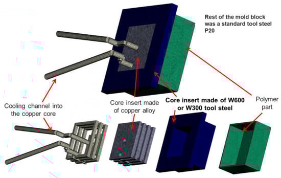 In order to validate the simulation results regarding the cooling time reduction, experiments were performed with two selected materials—a polypropylene (PP) and a polycarbonate (PC) grade. In order to reduce the infrared (IR) transparency of the two polymers, they were colored with dark color masterbatches. For the validation, only the core insert was composed of the two different mold materials W300 and W600 from voestalpine BÖHLER Edelstahl GmbH & Co KG (Kapfenberg, Austria). The concrete configuration of the mold with different materials is shown in Figure 4, and the corresponding thermodynamic material properties of the used mold materials are listed in Table 3.