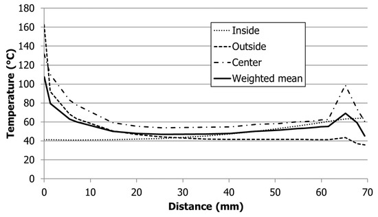 An IR camera (FLIR SC7000 from FLIR Systems Inc., Wilsonville, OR, USA) was first calibrated by using boxes of the two colored materials floating on temperature controlled water and measuring the infrared signal together with a conventional thermometer in the water bath. This measurement was repeated at different water temperatures. The emissivity setting of the IR camera was then adjusted to obtain the same temperature readings as on the thermometer. Despite the coloring of the materials and being optically opaque, the materials still turned out to be partly transparent to IR radiation to a certain extent, which caused major difficulties in the evaluation of the temperature signal when measuring the part in production. The camera was positioned on top of the moving mold half, and a robot took the part from the mold at the end of the cycle and positioned it in front of the camera for temperature measurement of the inside of the box. To compare the experimental data with the simulation data, a diagonal line from the center of the part to one of the corners (with the hot spot) was defined and evaluated in the IR camera results as well as the simulation results. Due to the IR transparency of the materials, the camera measured the radiation energy from the volume of the part with a higher intensity coming from the surface pointing toward the camera and a lower intensity from the opposite part surface. Contrary to that, in the simulation, the results were only available at certain discrete points. In order to be able to compare the simulation results with the experimental results, three evaluations along the defined diagonal were performed, one on the inside surface, one in the center, and one on the outside surface of the box. These three temperatures over the thickness were then weighted with higher weights on the inside, which is pointing toward the camera (Figure 5). For the given example of the 1 mm thick box of PP, the weights were 0.37 for the inside, 0.33 for the center and 0.3 for the outside. This was the best possible way to be able to compare the local temperature results from the simulation with the volumetrically based temperature results from the IR camera.