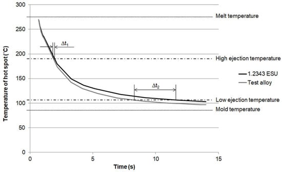 This found correlation is further explained with Figure 8, where the temperature of the defined hotspot as a function of time is shown for the ABS/PC grade and the box with 1 mm wall thickness. Additionally, the melt and mold temperatures as well as two cases of ejection temperatures (high and low) are shown in this graph. The denominator of the temperature coefficient (Tejection − Tmold) defines the slope of the cooling curve at the ejection temperature. In case of a significant difference between the ejection temperature and the mold temperature (high ejection temperature in Figure 8), the temperature gradient ΔT/Δt1 is high at the ejection temperature, which means that the occurring temperature difference ΔT due to the different thermal mold properties results only in a small time difference Δt1. In case of a small difference between the ejection and mold temperature (low ejection temperature in Figure 8), the temperature gradient becomes significantly smaller at the ejection temperature, and therefore, a similar temperature difference ΔT to the previous case results in a considerably higher time difference Δt2. The numerator of the temperature coefficient (Tmelt − Tmold) influences the temperature gradient especially at the beginning of the cooling process.