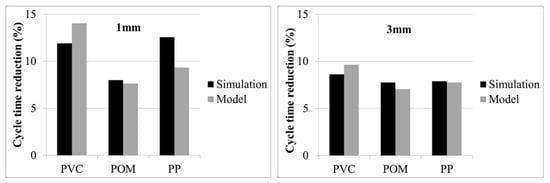 In order to validate the found correlation models, three additional polymers were randomly chosen from the Moldflow database (Table 4). For these polymers, the same simulations were performed and evaluated as already described for the other 18 investigated polymers for both wall thicknesses. Additionally, the expected cycle time reduction was calculated using the three given process temperatures from the Moldflow database and the correlation functions shown in Figure 7. The results of the simulations and the correlation model are compared for 1 and 3 mm wall thickness in Figure 9 and Table A3. The model is able to predict the expected cycle time reduction in a satisfying quality, although there are quantitative differences most likely explained by the different thermodynamic properties of the polymers, which were not considered in the model.