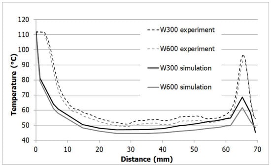 Due to the experimental limitations of the IR measurements and the different evaluation methods between experiment and simulation, a reliable quantitative comparison was not possible. The trends of the temperatures were comparable, however, between the simulation and experimental results. In Figure 10 an example of the results for the 1 mm box and PP is shown along a diagonal line from the center of the part (position 0 mm) to one corner of the part. The dotted lines represent the simulation results and the full lines the experimental data. The black lines correspond to the results obtained with the W300 insert, and the gray lines represent the results obtained with the W600 insert. The high temperatures in the center of the part result from the hot runner, which is permanently at melt temperature, and therefore, the part stays hot at this position. The temperature peaks at the corner of the part are a result of the overheating of the mold insert corners as the heat from the polymer is transferred into the mold from three sides, but it can only be carried away in one direction. This elevated temperature at the mold core results in a higher part temperature. This is also the position where the higher mold thermal conductivity has its best effect. While the absolute values do not match due to the limitations in the experiment as well as the evaluation of the simulation described in Section 2.2, the global trends are similar, and especially, the temperature differences between the two mold inserts are similar for simulation and experiment, which is the most important value, as it is used for the evaluation of the cycle time reduction. Based on these results we conclude that the simulation is sufficiently reliable to determine the temperature difference and hence the relative cycle time reduction for the different mold materials.
