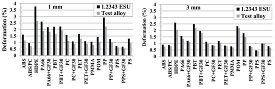 | Polymer | Deformation 1 mm Part 1.2343 ESU (%) | Deformation 1 mm Part Test Alloy (%) | Deformation 3 mm Part 1.2343 ESU (%) | Deformation 3 mm Part Test Alloy (%) |