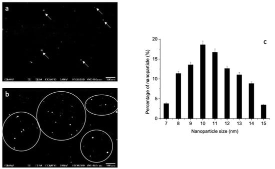 The dimensions of the nanoparticles observed in the SEM micrographs were obtained using the AutoCAD 2007 software. The particle distribution histogram is shown in Figure 3. This histogram was obtained from three micrographs for every investigated film, which have been prepared from solutions with different HAuCl4 concentrations. Most of the nanoparticles had sizes between 9 and 12 nm (about 60%, Figure 2). The UV–Vis spectrum demonstrated maximum absorption bands between 530 and 535 nm for all investigated films (not shown). This wavelength range corresponds to an approximate particle size [,] obtained from SEM micrography and confirms that particle size did not depend on the HAuCl4 and SC concentrations.