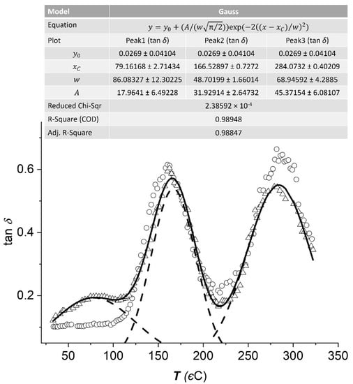 Figure 5 shows tan δ versus temperature for the CS/AuNP film obtained from the solution with 0.2 mM of HAuCl4 during the first scan with a moisture content of about 10.4% (as-prepared film) and the second scan (annealed film at 120 °C with subsequent cooling to room temperature) with a moisture content of less than 0.2%. Points are experimental data, the continuous line was obtained by fitting the experimental data using a Gauss distribution, and the dashed lines are used to visualize the positions of the peaks obtained from the fitting with R^2 = 0.988.