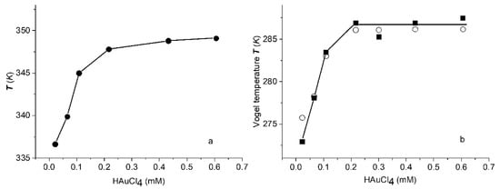 Dependencies on HAuCl4 concentration of: (a) the first peak position obtained from DMA measurements and (b) Vogel temperature obtained from conductivity (open circles) and dielectric (black squares) measurements. All measurements were carried out on as-prepare films.