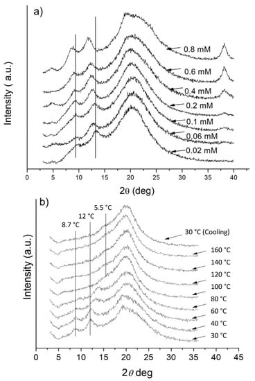 Figure 7a shows XRD spectra for the as-prepared films at room temperature obtained from solutions with different HAuCl4 concentrations. All spectra show diffraction lines around 2θ = 8.7°, 12° and 20° and a weakly resolved line at 21.8°. The peaks around 8.7°, 12°, and 21.8° should be assigned to the hydrated form of CS which correspondent to crystal forms II [,,,,,,]. The strongest reflection that appeared at around 20° corresponding to the amorphous phase. With increasing HAuCl4 concentrations, the diffraction lines around 8.7° and 12° shift to lower 2θ values. Additionally, at high HAuCl4 concentrations, a reflection appeared at 2θ = 38.18°, corresponding to the reflection from Au nanoparticles.