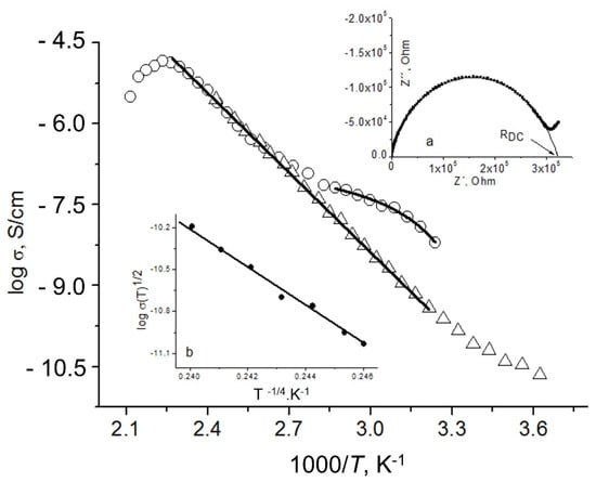A nonlinear dependence before the percolation threshold has been observed in many polymers and can be explained using the variable range hopping (VRH) model proposed by Mott [,,] well described by Equation (5). According to this model, the dependence of DC conductivity on temperature T can be written as: