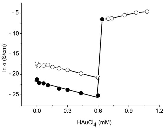 At a HAuCl4 concentration of about 0.6 mM, the conductivity of both the wet and dry films sharply increased by six orders (from 10−9 to 10−3 S/cm), corresponding to the percolation effect. However, according to our micrograph (Figure 2b), no physical connection between Au nanoparticles is observed. According to the reaction proposed above (Scheme 1), salts of HAuCl4 and NaCl exist in films. Thus, we can propose that the percolation effect can be related to the appearance of a conductivity pathway between AuNPs and salts.