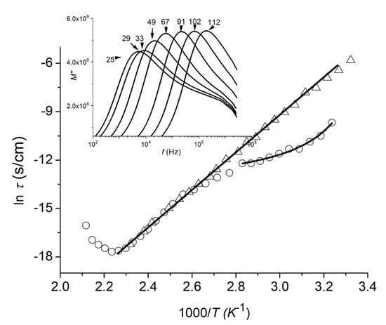 Interpreting the experimental data in this form is commonly employed to obtain information on the relaxation processes in ionic conductive materials and polymer–conductivity nanoparticle composites. In this representation, interfacial polarization and electrode contributions are essentially suppressed [,]. The corresponding relaxation time can be calculated using the relation τ = 1/(2πfp), where fp is the peak frequency in the dependence of M″ on frequency []. The position of the peak in the imaginary part of M″ depends on the temperature.