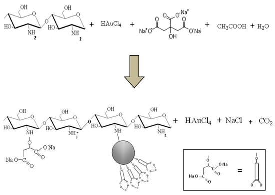 The synthesis of Au nanoparticles in CS using SC is complex because, in this case, HAuCl4, CS, and SC are ionized simultaneously. Therefore, during the reaction, several electrostatic interactions between CS, SC, and the Au salt can be observed. A previous study [] proposed that the nanoparticles obtained during synthesis are surrounded by sodium succinate, which provides stability to the structure and reduces the agglomeration effects. Additionally, according to Refs. [,], sodium succinate forms hydrogen bonds with the polymer matrix. Based upon these results, we can propose the following reaction between CS, HAuCl4, SC, and acetic acid: