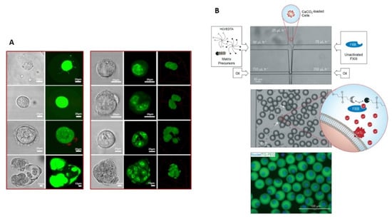 Figure 2. (A) Representative confocal microscopic images of cell growth of single MSCs within microgels. Live and dead cells were stained with Calcein and Ethidium Homodimer whereas alginate was labelled by the fluorescein. Reprinted from Ref. [53], Copyright 2020, with permission from Elsevier. (B) Single cell-laden 3D microgels mimicking stem cell niches in vitro (microniches) fabricated by droplet-based microfluidics. Matrix precursors, a diluted solution of cells loaded with CaCO3 nanoparticles, and unactivated Factor XIII (FXIII) are separately injected into a microfluidic chip. Reagents are joined in a laminar flow resulting in an emulsion for hydrogel formation. Cells, encapsulated in FITC labelled microniches, were stained with Hoechst 33342. Republished with permission of Royal Society of Chemistry, from Ref. [16]; permission conveyed through Copyright Clearance Center, Inc.